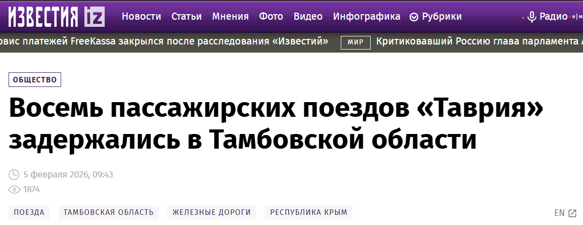 《消息报》报道称,2月5日,8列开往克里米亚、辛菲罗波尔等地的塔夫里亚型客运列车,因坦波夫地区轨道上记录到的货车脱轨事故而延误。这一消息由铁路运输公司Grand Service Express(GSE)的新闻服务于2月5日上午报道。